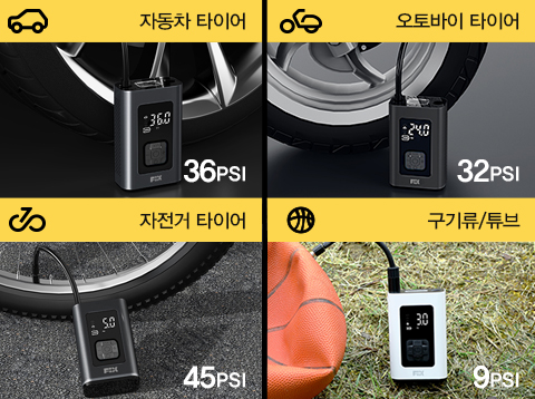 오토바이의 타이어부터 구기류까지 4가지 모드로 다양하게 설정 가능하며, 모드 선택 시 대상에 최적화된 압력 값으로 사전 설정되어 있어 더욱 빠르고 편리하게 공기 주입 가능합니다.