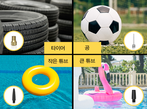 에어펌프 하나로 여러 대상 공기주입 가능하도록 타이어, 공, 튜브 각 대상에 맞는 4가지 니들을 지원하여 다양한 제품 공기주입이 가능합니다.