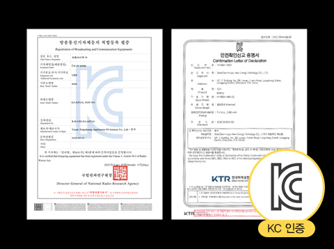전기용품안전인증인 KC 인증은 물론, 전자파 적합 인증까지 받아 장시간 공기주입에도 안전한 사용 가능합니다.