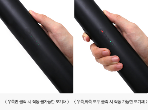 국가 기관에서 공식적으로 허가된 2중 안전장치로 설계되어 좌, 우 버튼 2개를 동시에 눌러야 작동하며, 모기채 전후면으로 감전 보호망을 적용하여 안전하게 사용 가능합니다.