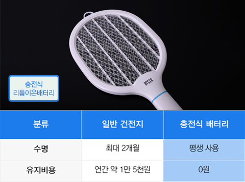 건전지를 사용하는 저가 모기채와 달리 충전식 리튬이온배터리를 탑재하여 강력한 전압으로 순간 살충은 물론, 충전만 하면 건전지 구입 등 유지비용 없이 평생 사용 가능합니다!