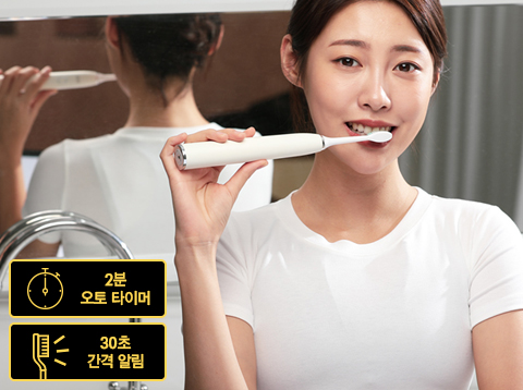 픽스 클린 음파 전동 칫솔은 2분 오토 타이머 기능을 탑재하여 전원을 켜면 칫솔기가 2분 동안 작동됩니다. 게다가 30초 간격 알림 기능을 적용하여 30초마다 칫솔질 방향을 바꾸어 치아의 4분 면을 고르게 세척할 수 있습니다.