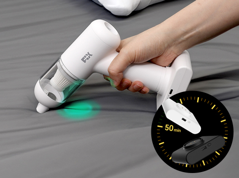 고급 리튬이온 배터리팩을 장착해 기본적으로 20분간 연속 사용이 가능하며, 추가 배터리팩을 장착하면 최대 50분까지 끊김 없이 청소할 수 있습니다. 배터리 장착 만으로 집안은 물론 야외에서도 여유롭게 청소가 가능합니다.
