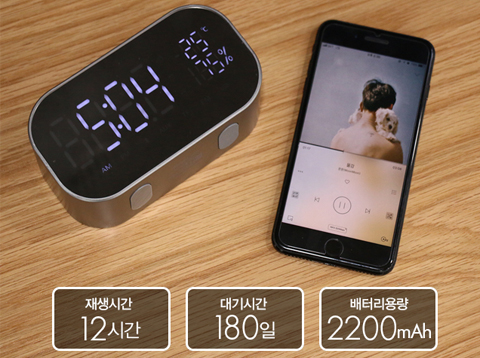 타사 대비 약 2배가량 늘어난 용량인 2200mAh의 대용량 배터리를 탑재하여 최대 12시간 연속으로 음악을 재생할 수 있습니다.