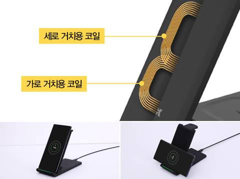 전면에 무선 충전 듀얼 코일이 탑재되어 스마트폰 방향 상관없이 가로, 세로 자유롭게 충전 가능합니다. 스마트폰을 중앙에 놓고 충전하셔야 끊김 없이 충전하실 수 있습니다.