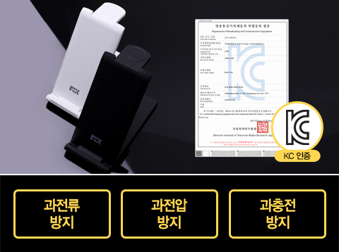 KC 인증받아 장시간 충전에도 안전하며, 과전압을 방지하여 스마트 기기를 보호해 주고, 온도감지센서가 내장되어 있어 발열에 대해 안심하고 사용하셔도 됩니다.